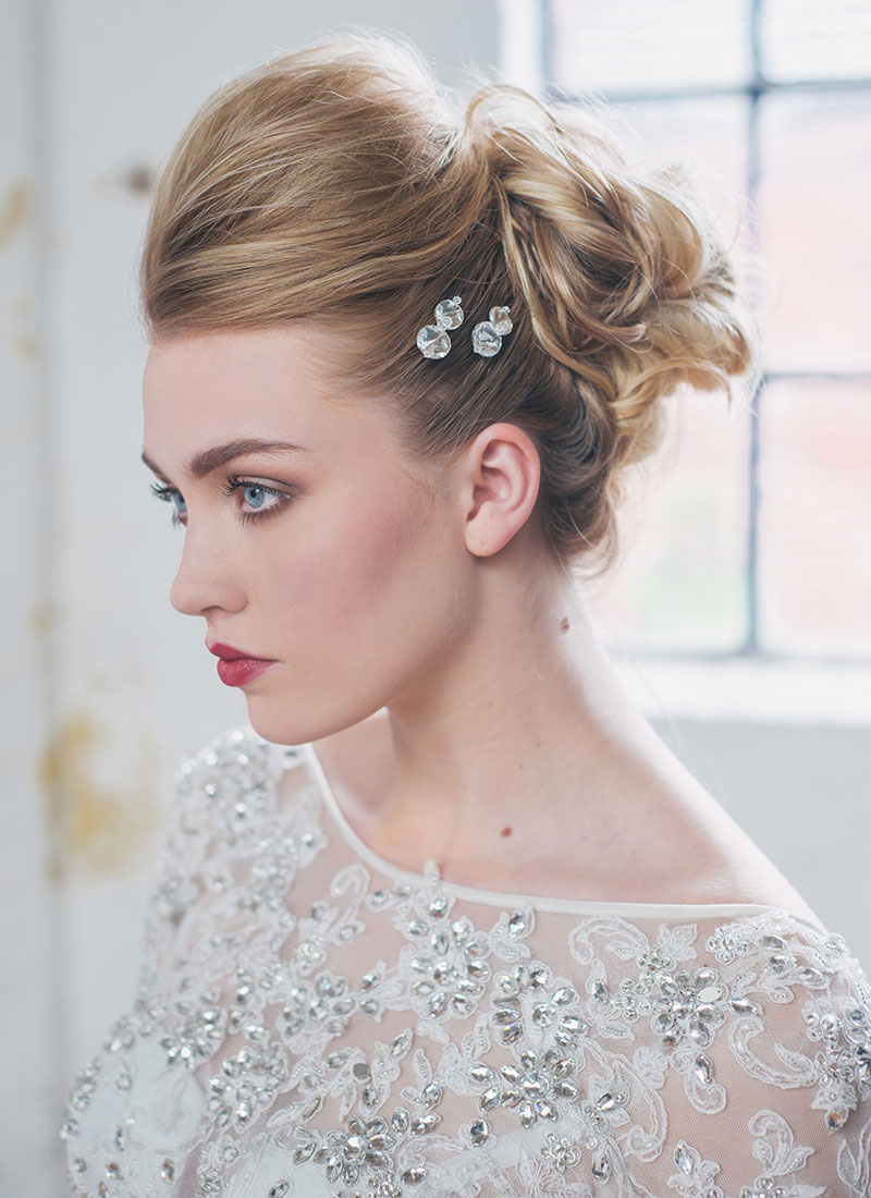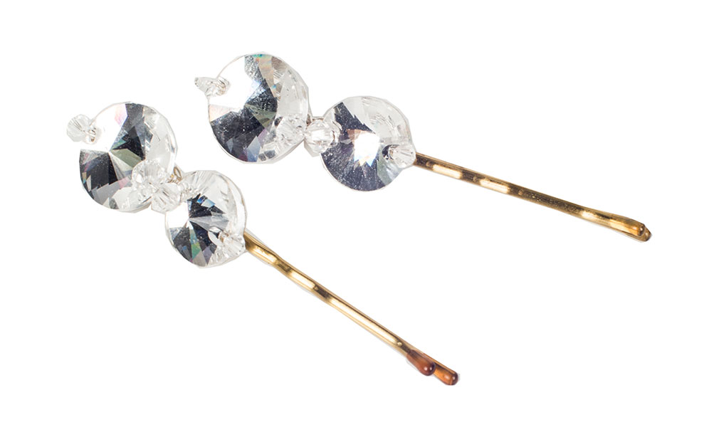 Two large Swarovski flat back crystals woven onto a choice of bronze or golden hair pins with small Swarovski bicones. Perfect to wear in plaits or into a bun.
