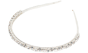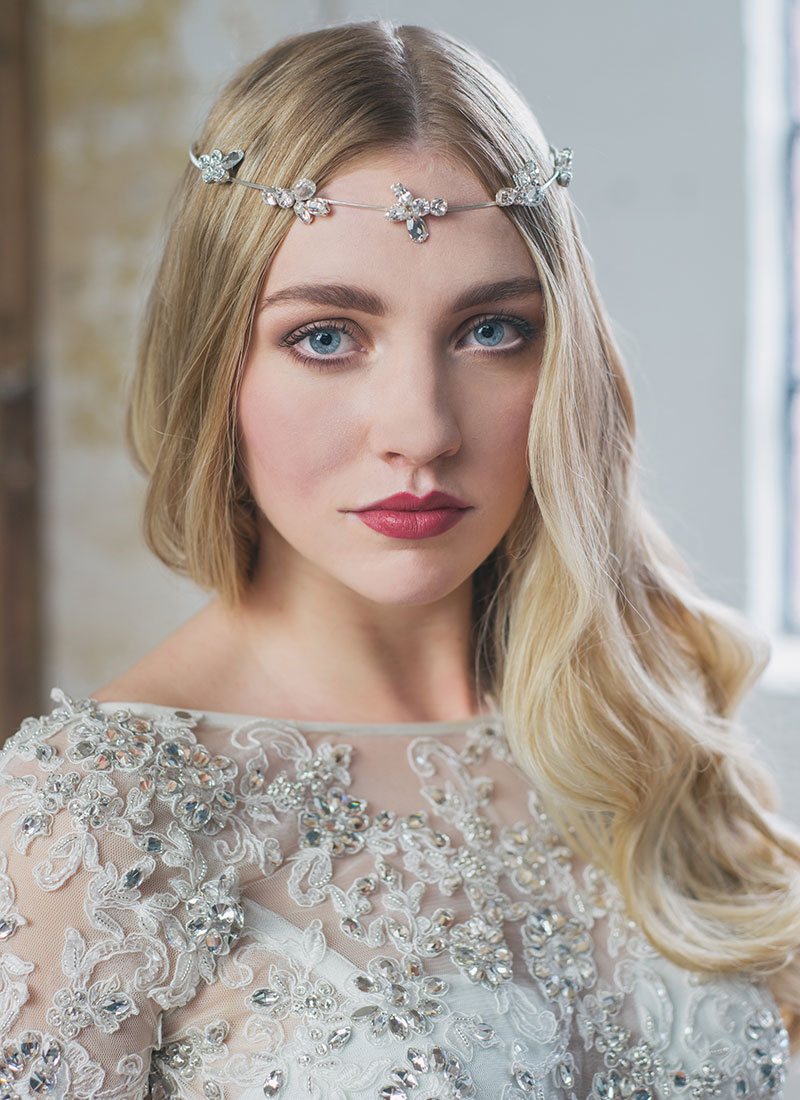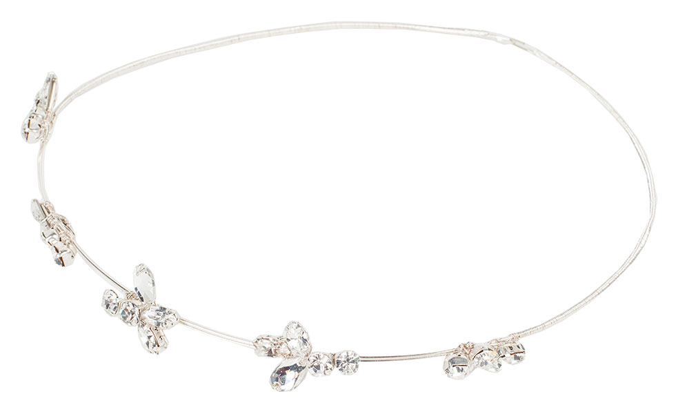 A delicate forehead or browband with five pretty little blossoms of Swarovski crystals and Diamante beads, sewn with silver plated wire onto a woven silver wire band with a hook fastening.