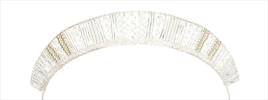 Delicate tiara style headband designed with Swarovski clear crystals, silver and golden pewter toned glass beads and silver plated wire upon a silver plated headband. Anoushe is a simple but stunning headband perfect for brides wanting to add just a touch of sparkle.