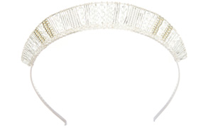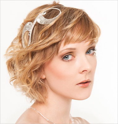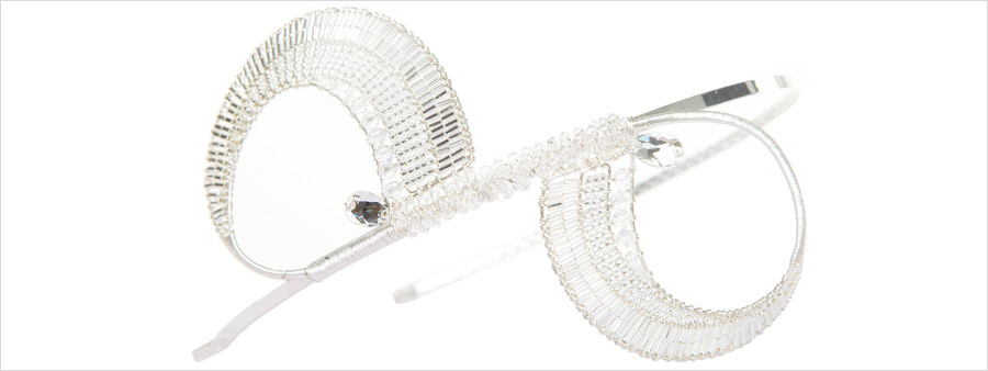 Created with Swarovski clear crystals, glass beads in silver and clear tones and silver plated wire upon a silver plated headband. Beautiful spirals of crystals surrounding two sparkling flat back Swarovski crystals. This piece sits to the side of your head glistening on every turn.