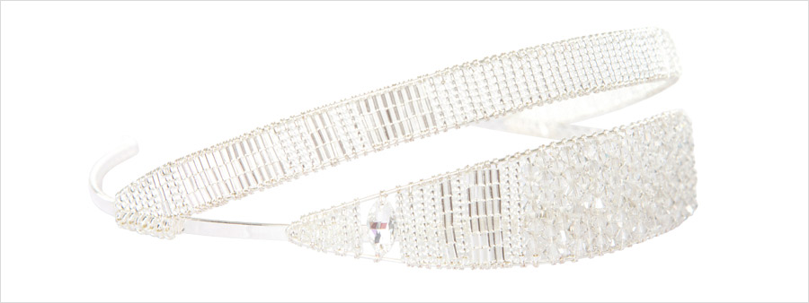 Manette is the off centre headband design that is both pretty and unique in style. Pointed oval detailing is highlighted with Swarovski flat back crystals and a showering of silver toned crystals. An extra band of glass beading enhances the detailed beadwork in the centre and its comfortable to wear all day long.
