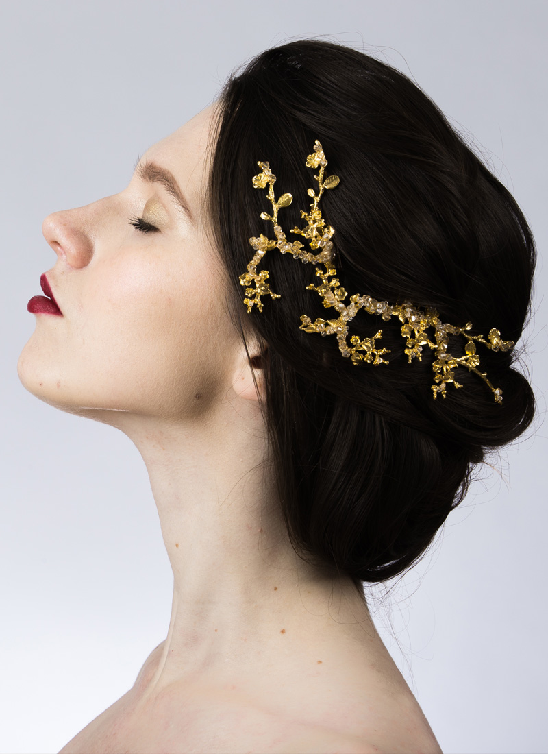 Golden trailing twig styled headpiece fixed upon a comb to be worn at the side of the head or upon a bun at the back of the head, co designed with Phoebe of the So You’re Getting Married blog. Created with hundreds of Swarovski crystals, gold plated twig shapes and gold plated wire, this gorgeous piece is easy to wear, lightweight and has a timeless look.