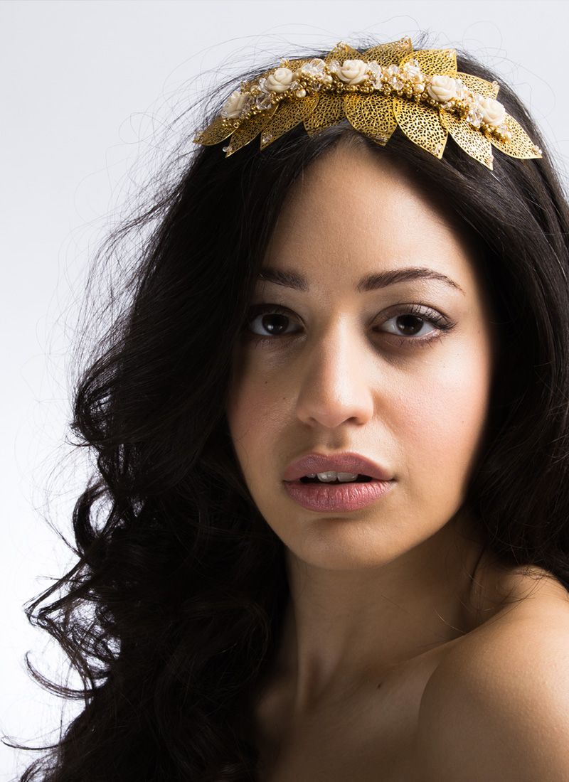 Gorgeous raised headband design with gold plated leaves, golden Swarovski crystals and acrylic flowers created on a bed of glass beads, crystals and freshwater pearls. Bohemian glamour with a soft feminine finish, co designed with You & Your Wedding Magazine. This headpiece can be worn slightly further forward or even near the back of the head around an up do to add a touch of sparkle.